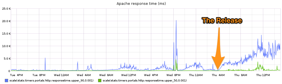 One fine day, after a release of Portals (our webapp that lets you work with data from your cloud-enabled devices), I noticed something odd in the server metrics. The 90th-percentile response time had increased by a factor of four!