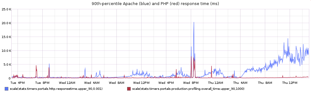 This does not follow the same pattern. Sure there’s some variability, but they’re both response time: shouldn’t they follow each other more closely? And let’s look at the 90th-percentile times for Apache (blue) and PHP (red) on a common scale: